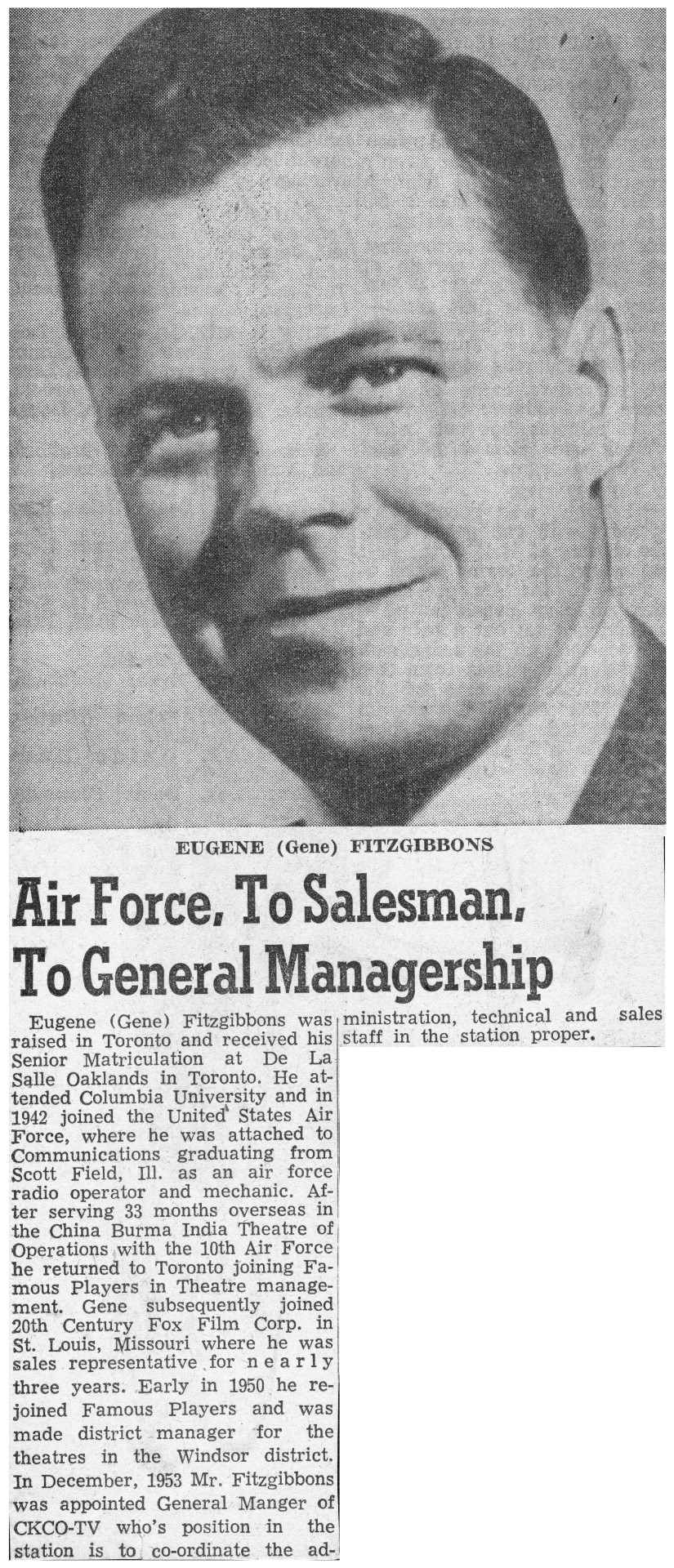 The family is sad to announce the passing of Gene (Eugene Edward) Fitzgibbons on Tuesday, January 27, 1998 at Mount Sinai Hospital in his 76th year.Beloved husband of Betty for 52 years, loving father of Mary Jane Sallinen of Parry Sound, Robert of Toronto, loving grandfather of Nicholas Sallinen. Father-in-law to John Sallinen. Dear brother of Kevin (Kathleen) of Toronto, and Robert (Gert) of Australia. Predeceased by Yvonne, John, Helen and Arthur. As one of the Canadian Cable Television Pioneers, he was responsible for helping to establish numerous Cable Television Systems in Canada, including the former Toronto Metro Cable System. Sales Exec. 20th Century Fox– St. Louis, Managing Director Paramount Windsor Theatres, Exec. Director CKCO T.V. Kitchener, CFCM–T.V. Quebec City, V.P. Famous Players Theatres, V.P. Canadian Cable Systems, V.P. Selkirk Communications Ltd., Pres. Selkirk Communications Inc., Fort Lauderdale, Florida. He served in the United States 10th Air Force, 490th Bombardment Squadron in the China–Burma–India Theatre; awarded the Bronze Star while in Burma. Long time member of Lambton Golf and Country Club. Friends will be received at the Turner & Porter Yorke Chapel, 2357 Bloor Street West, at Windermere, near the Jane subway on Thursday, January 29 from 3 – 6 p.m. Funeral Mass will be held at Our Lady of Sorrows Catholic Church, 3055 Bloor Street West (Bloor and Royal York Road) on Friday, January 30, 1998 at 10 a.m. In lieu of flowers, a memorial donation to the Lung Association or to the Canadian Cancer Society would be appreciated.