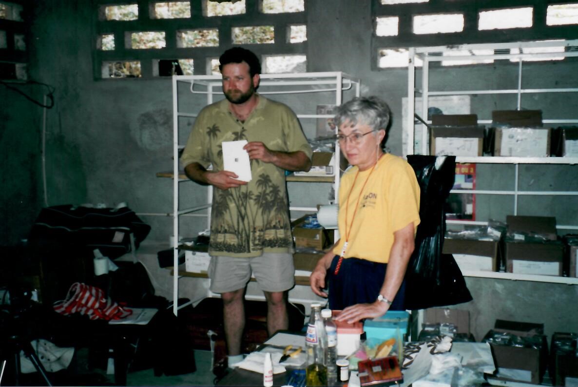 - Helping Joanne Atkinson, Rayjon Coordinator, with the eye test. Doraval, Haiti, 2002